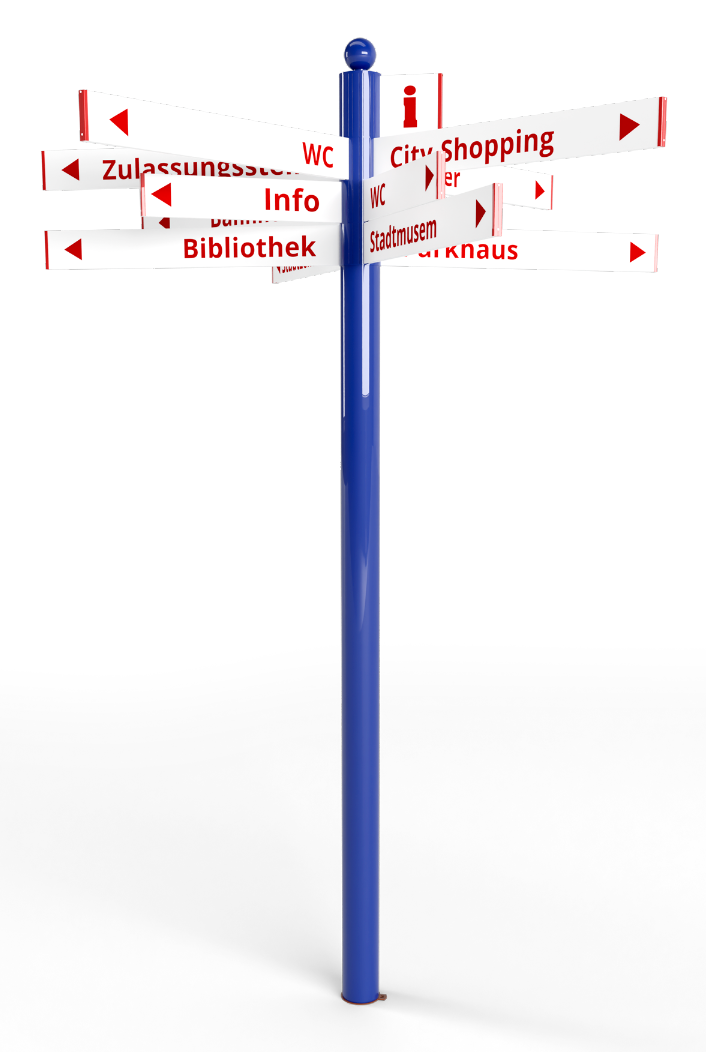 Auf großflächigen und verzweigten Grundstücken, Firmen, Behörden oder Verwaltungen geben Fahnenwegweiser jedem Besucher die passende Richtung vor. Sie können bis zu 12 Richtungen auf mehreren Ebenen ausweisen und auch in Zukunft zusätzliche Fahnen installieren. Zierelemente, Symbole und Farbleitkonzepte geben zusätzliche Klarheit.