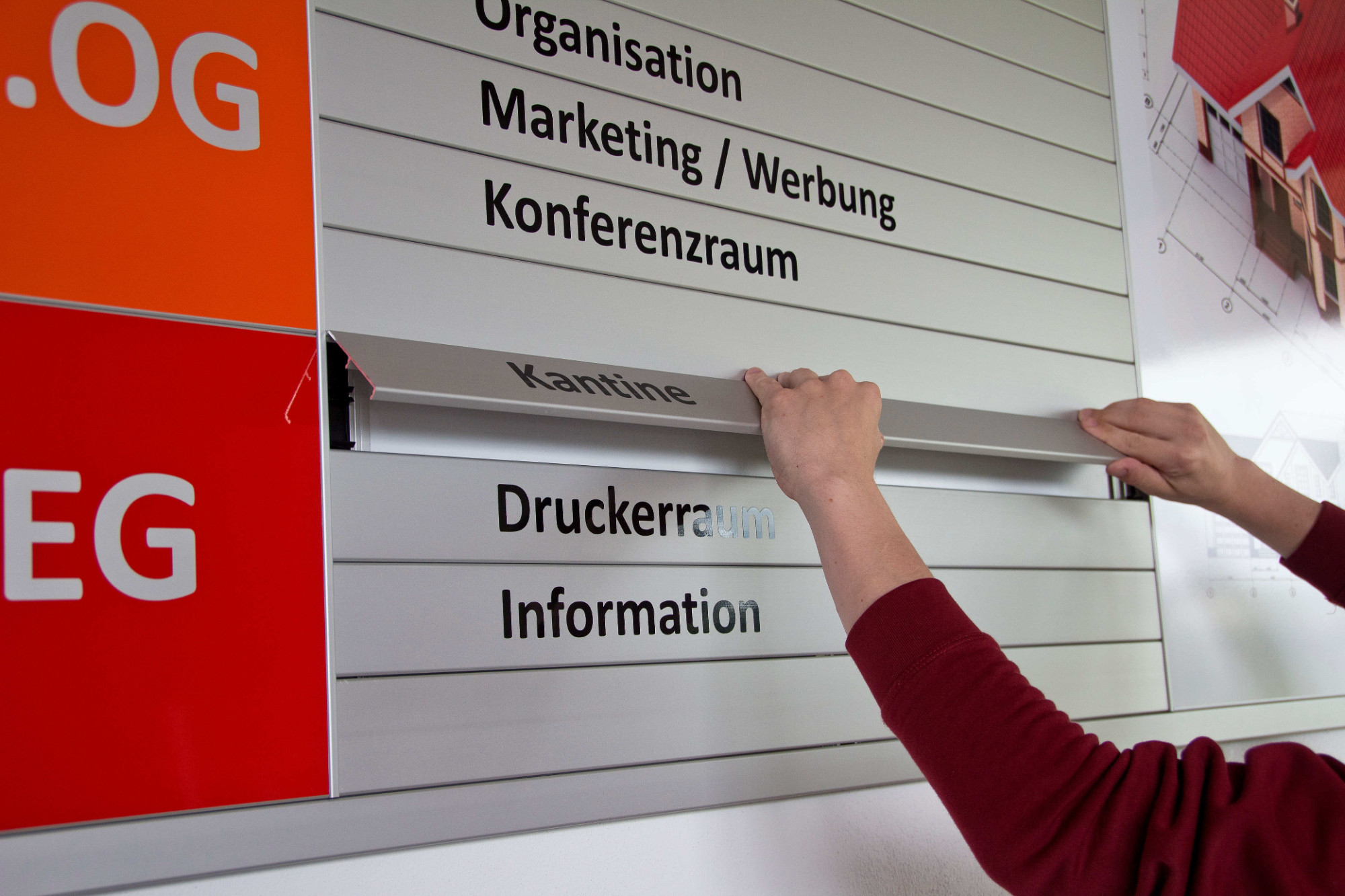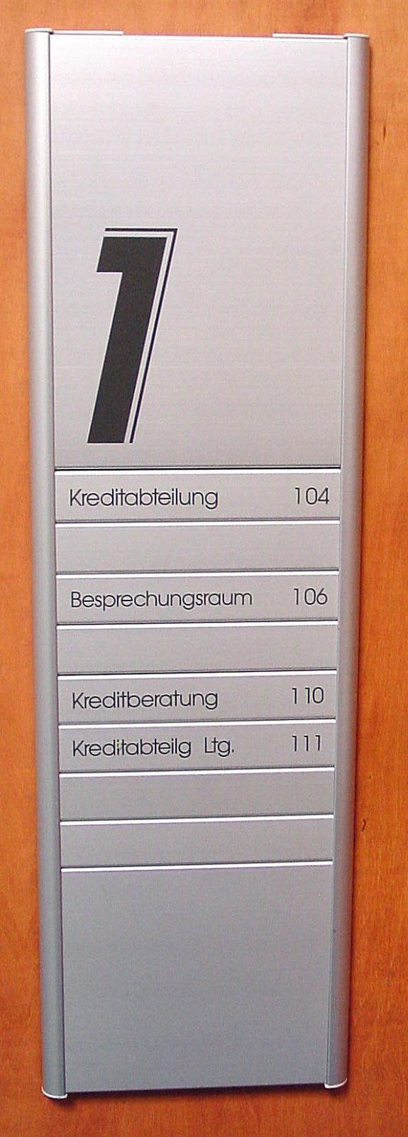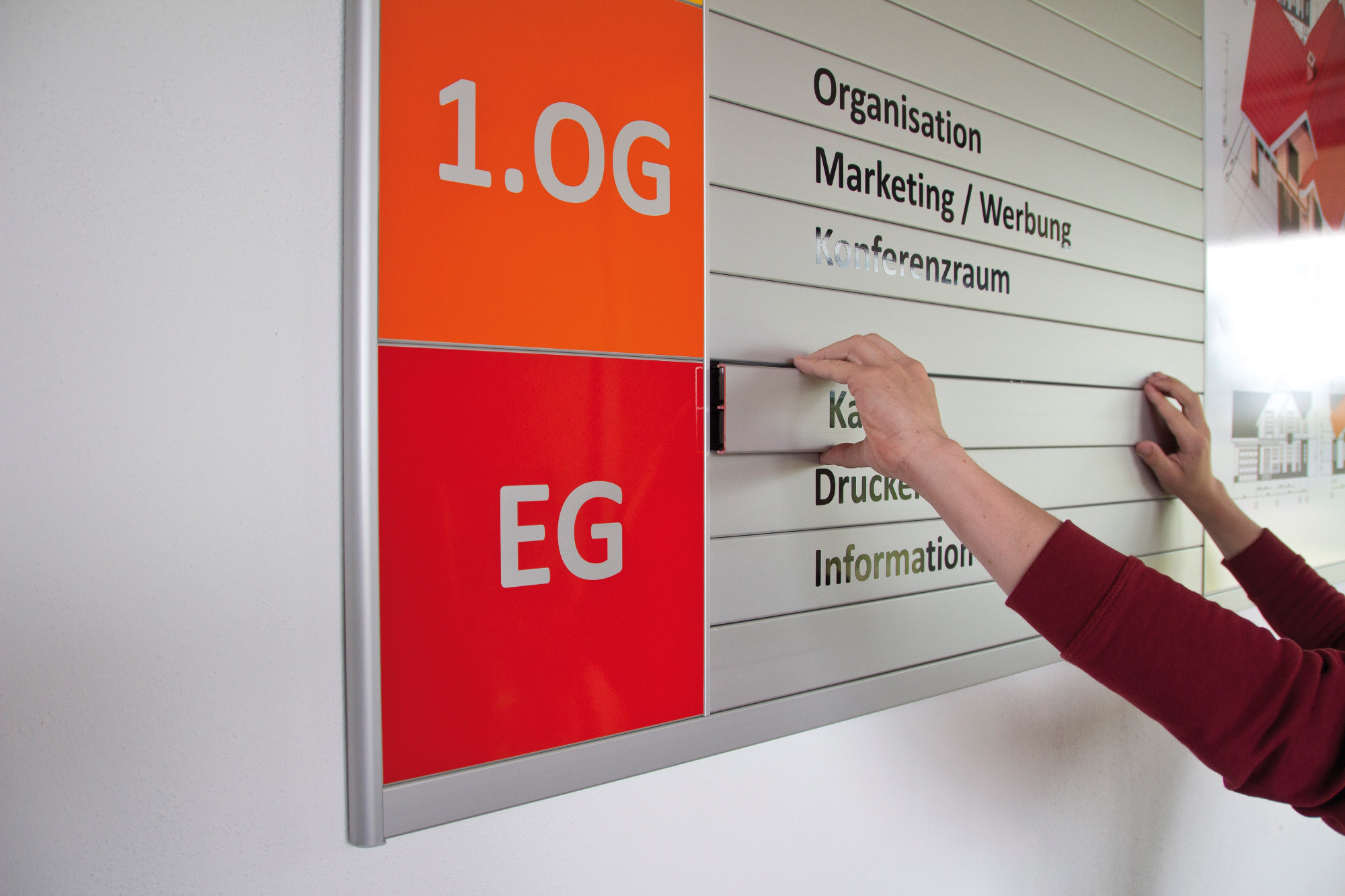 Türschilder, Wegweiser, Lagepläne sind mühelos realisierbar. Text- und Einschubpaneele sind wechselbar und werden mit Folie dauerhaft beschriftet.