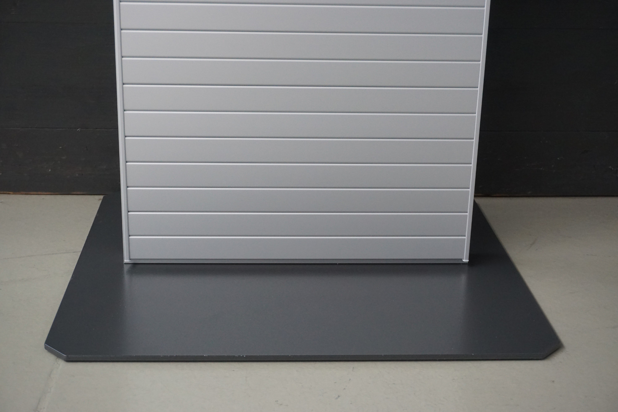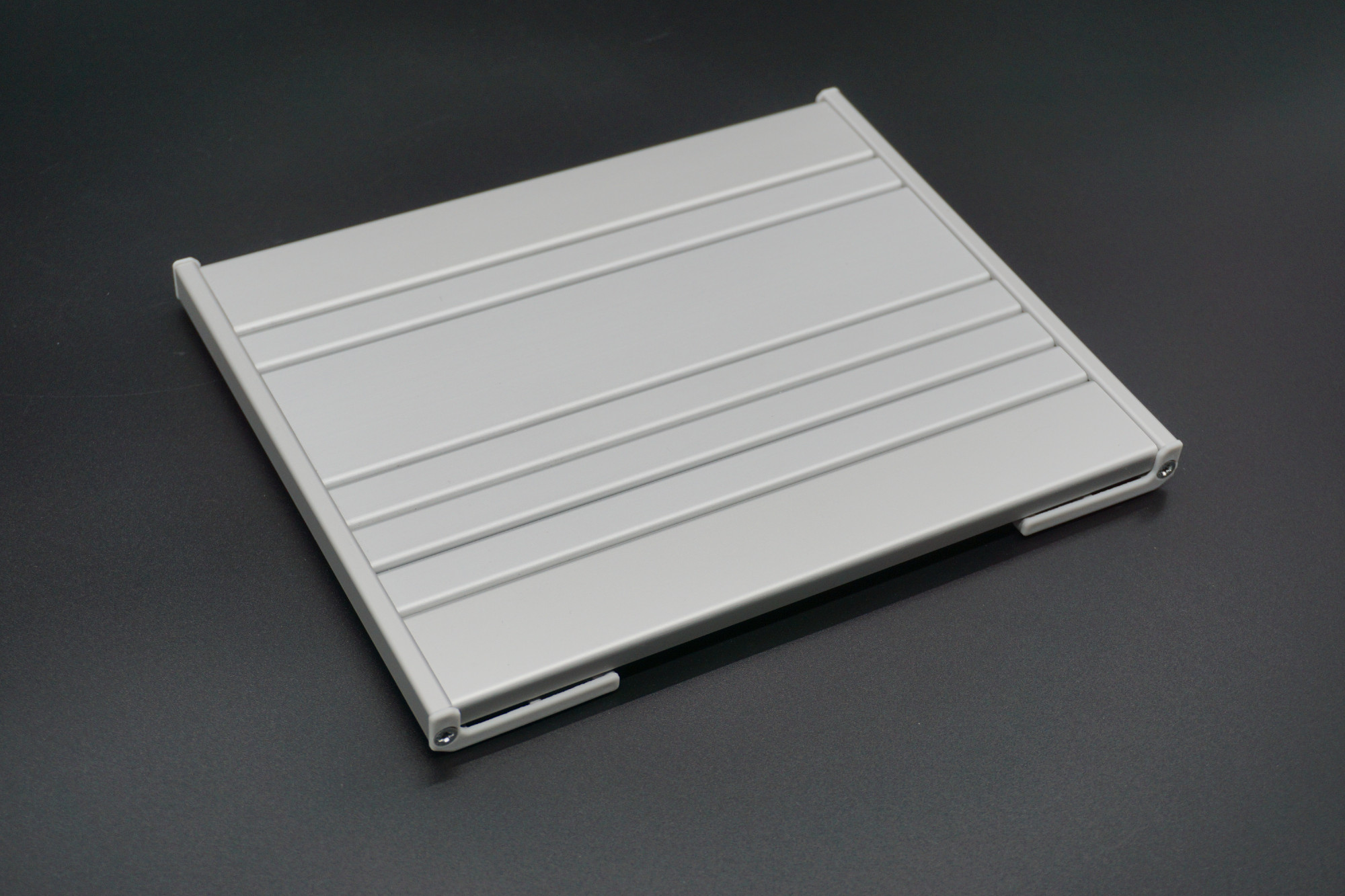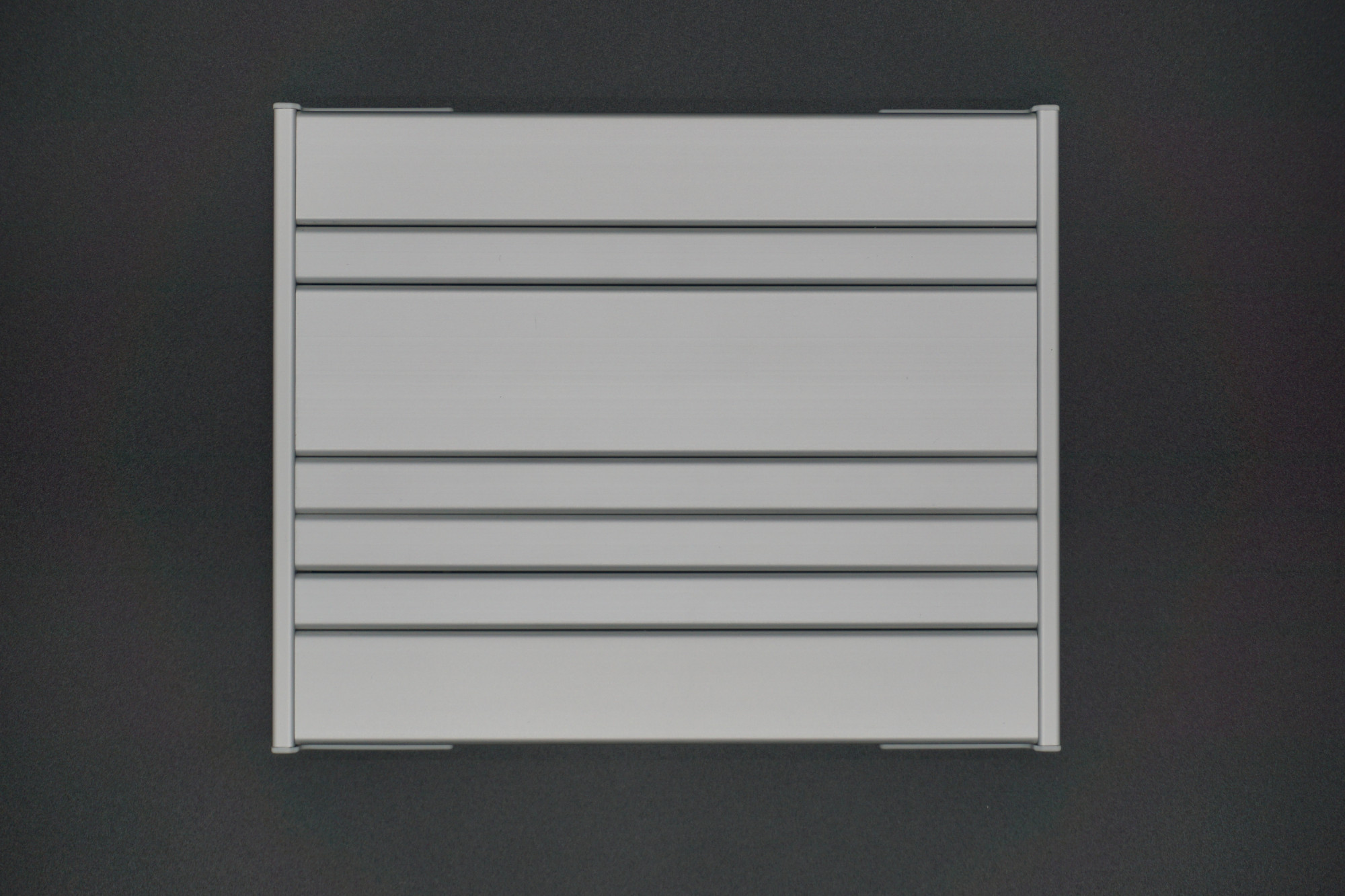 Alle Paneele sind aus Aluminium. Die Montage erfolgt durch Aufclippen auf unsichtbare Kunststoffclips, die in Aluminiumrandleisten eingeschoben sind.