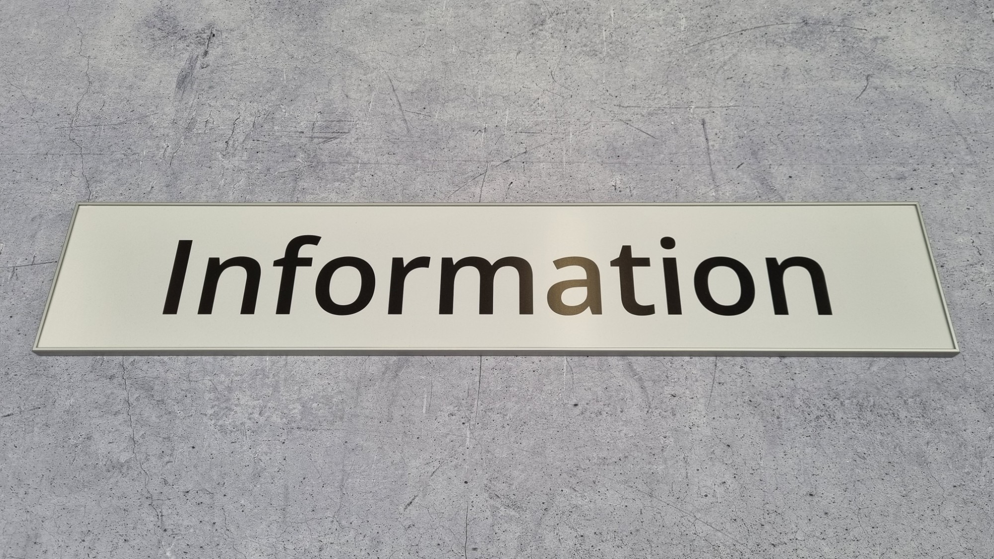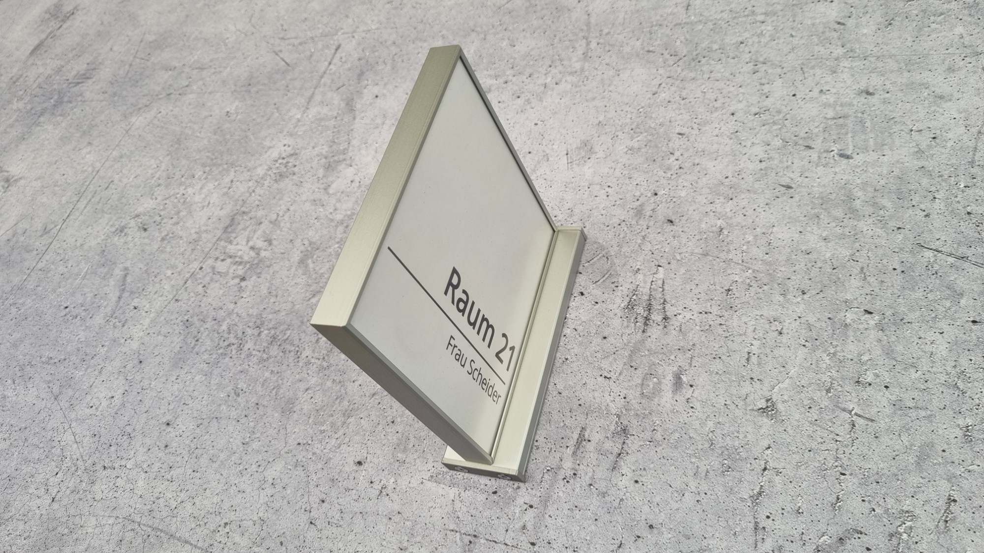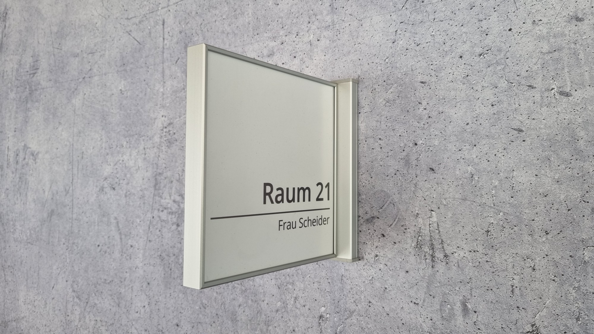 Der schmale umlaufende Rahmen, mit der geringen Bautiefe von nur 12 mm, gibt der Innenbeschilderung von Gebäuden einen dezenten und eleganten Ausdruck.
