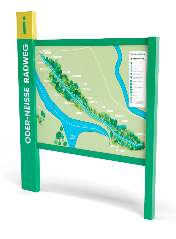 Langlebig, witterungsbeständig und stabil – mit diesen Eigenschaften sind unsere modularen Aufsteller und Schildersysteme wie gemacht für die Präsentation bzw. Aufnahme von Radwanderkarten, Informationstafeln oder Wanderkarten. Die vielen Kombinationen lassen auch eine individuelle Gestaltung mit regionalem Bezug zu.