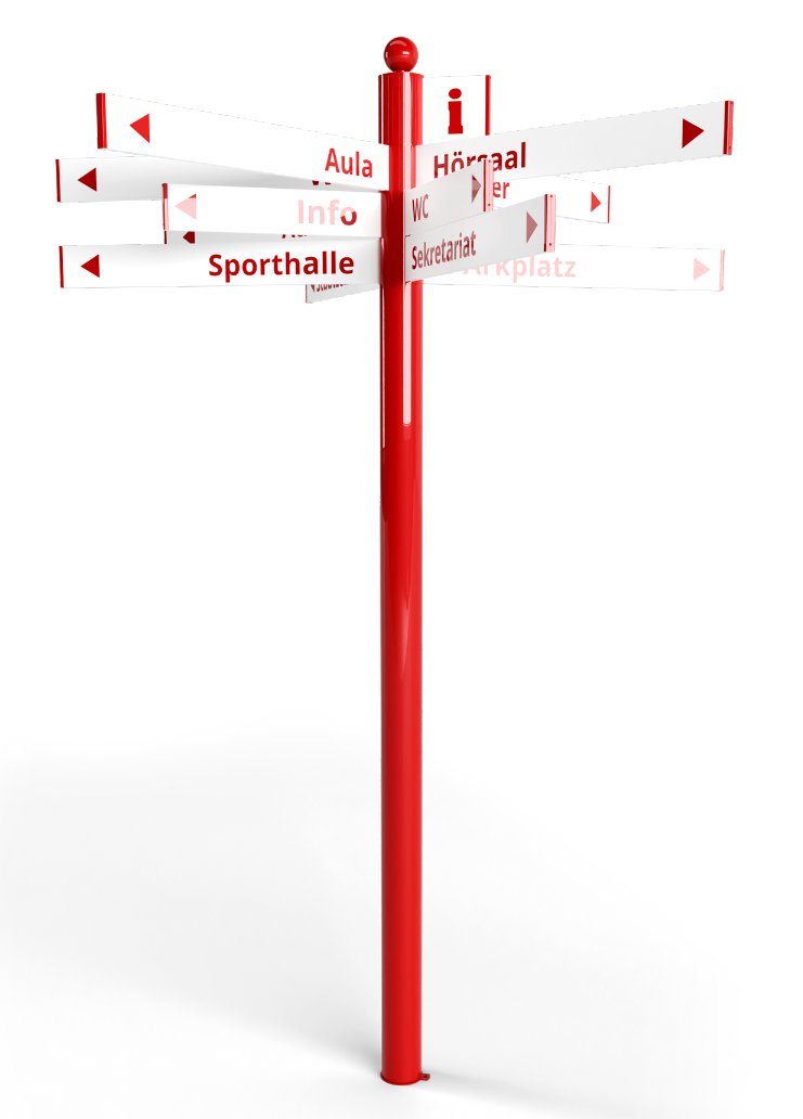 Klare Richtungsvorgaben und damit eine sichere Orientierung ermöglichen unsere Fahnenwegweiser. Das stabile und witterungsbeständige System hält auch anspruchsvollen Orten stand. Um Schäden durch Sticker oder Graffiti zu verhindern bieten wir Anti-Sticker- und Anti-Graffiti-Beschichtungen an. Diese können auch nur an einem Teil, zum Beispiel dem Standrohr, durchgeführt werden.