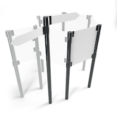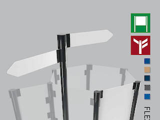 Unsere Lösung für ein leichtes und zugleich flexibles Aufsteller- oder Wegweisersystem ist Flex. Mit Hilfe von Schellen in verschiedenen Höhen, lassen sich Fahnen oder Platten verschiedener Stärken klemmen.