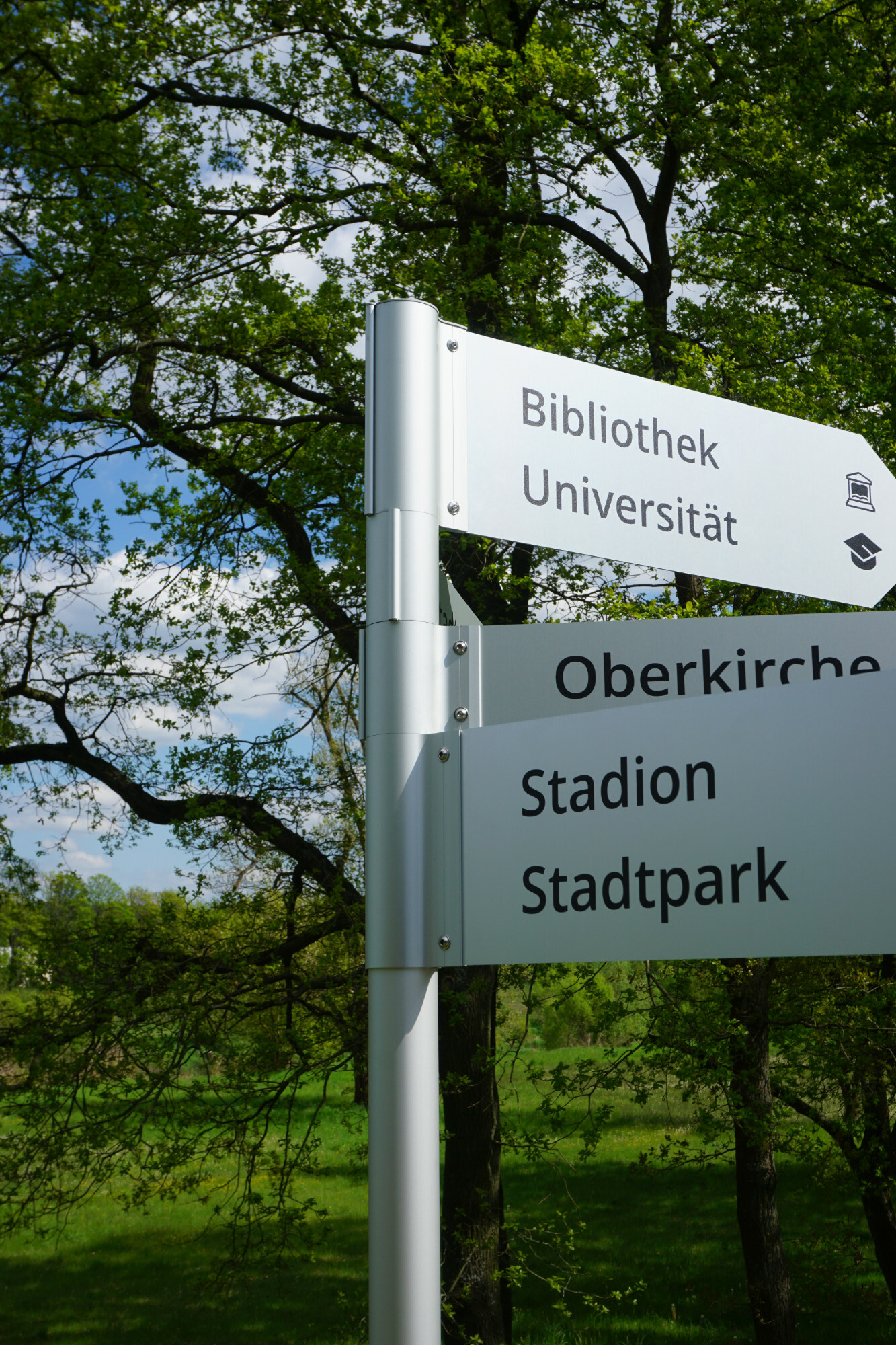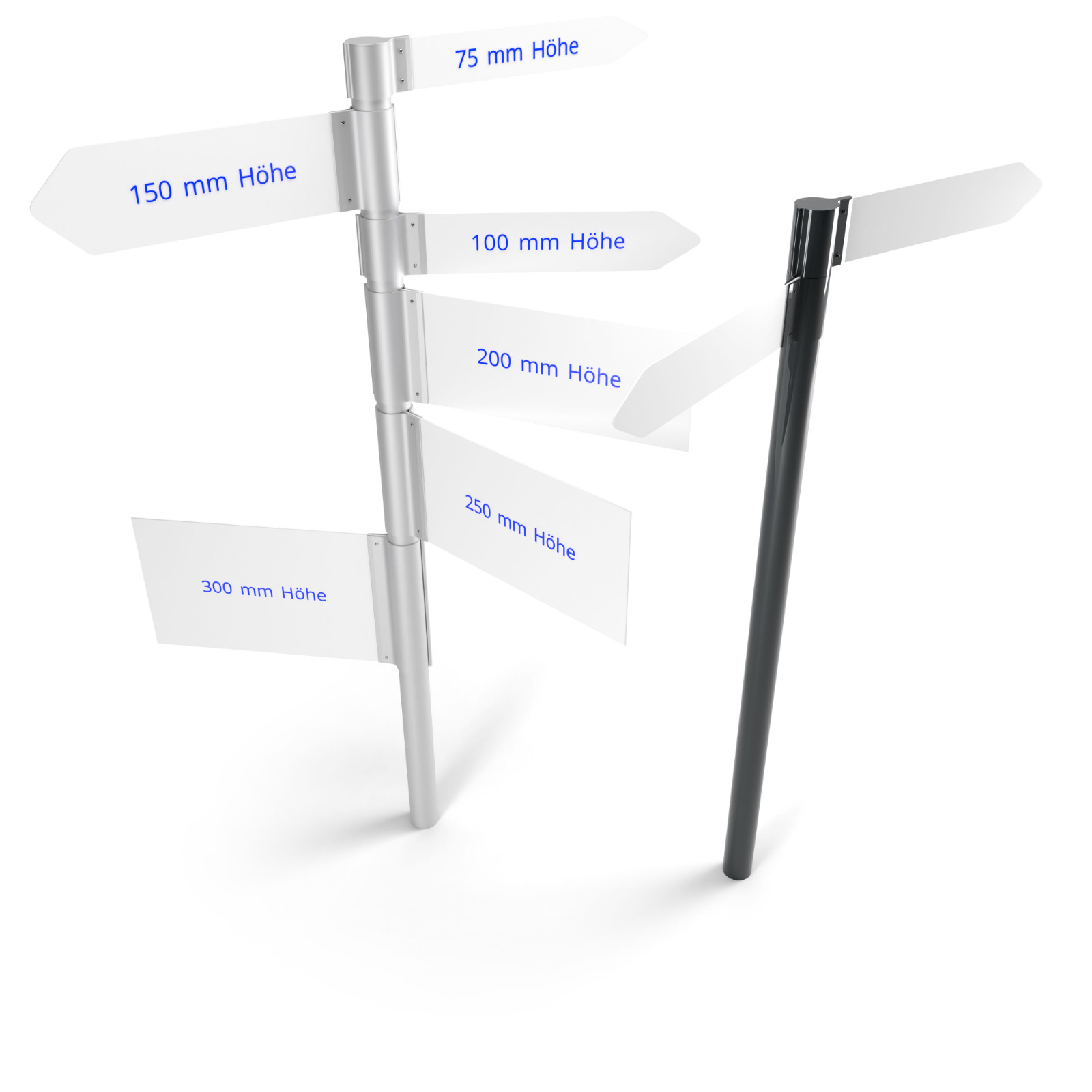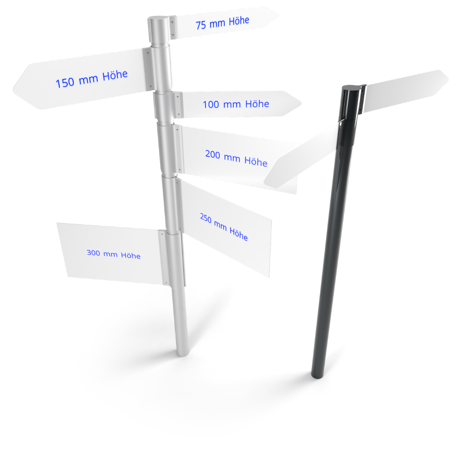 Unsere Lösung für ein leichtes und zugleich flexibles Aufsteller- oder Wegweisersystem ist Flex. Mit Hilfe von Schellen in verschiedenen Höhen, lassen sich Fahnen oder Platten verschiedener Stärken klemmen.