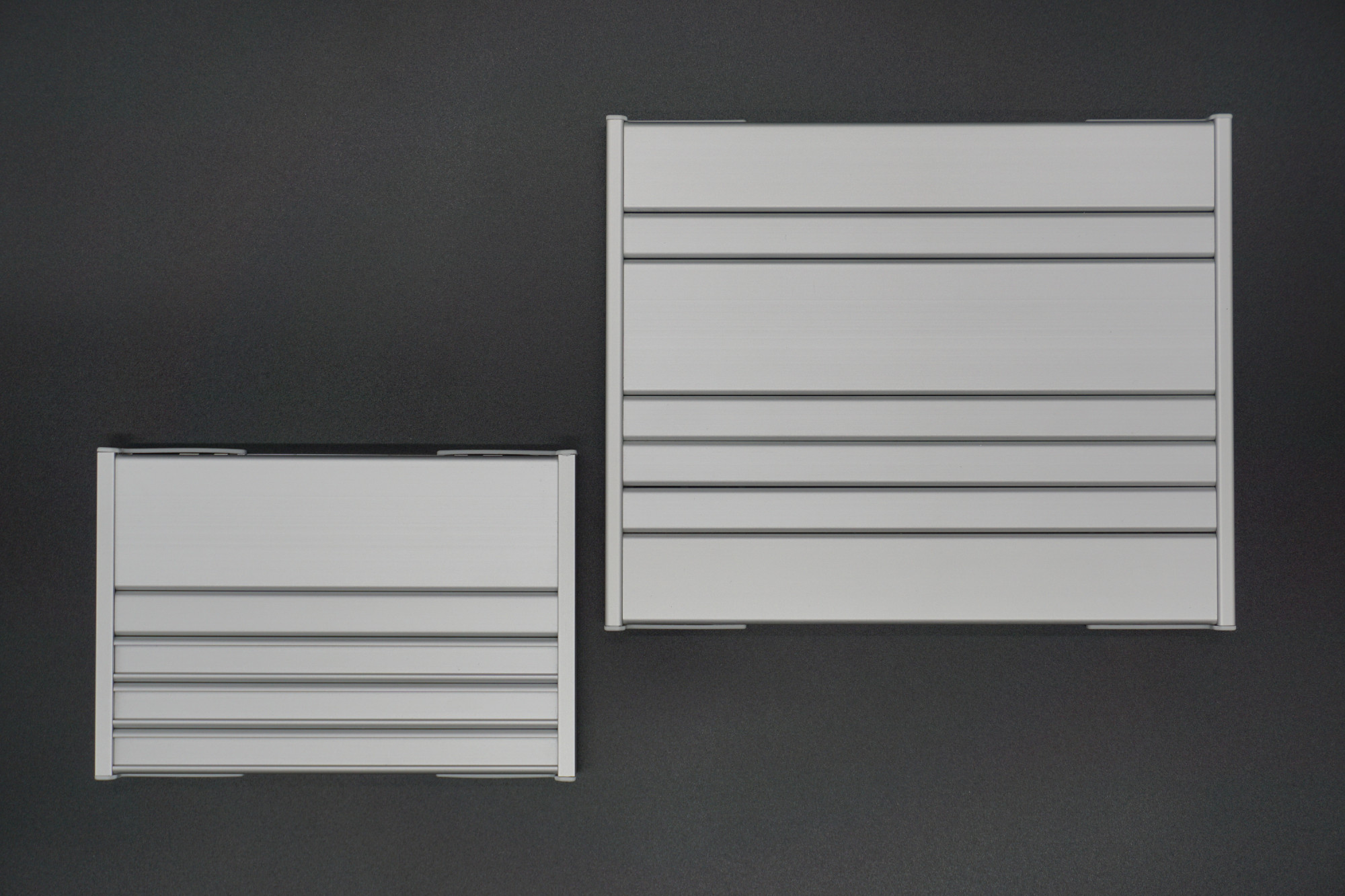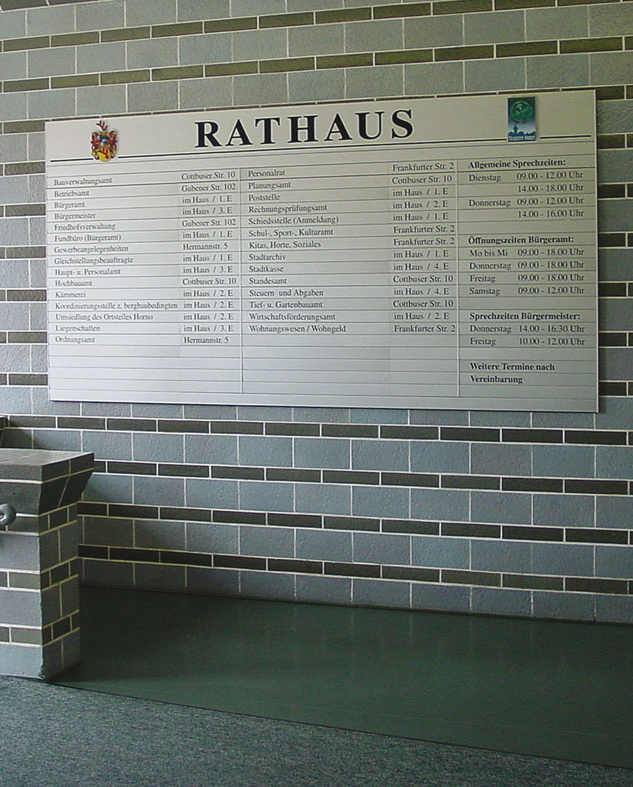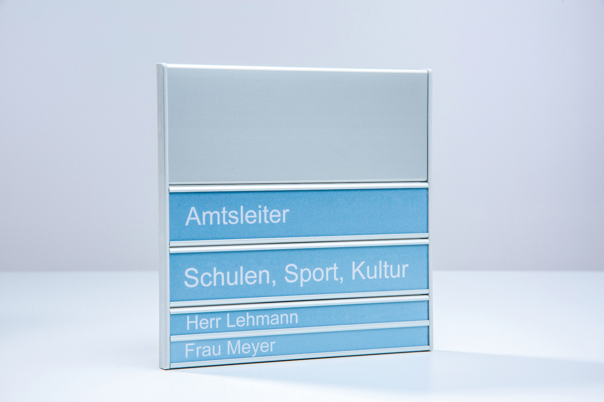 Türschilder, Wegweiser, Lagepläne sind mühelos realisierbar. Text- und Einschubpaneele sind wechselbar und werden mit Folie dauerhaft beschriftet.