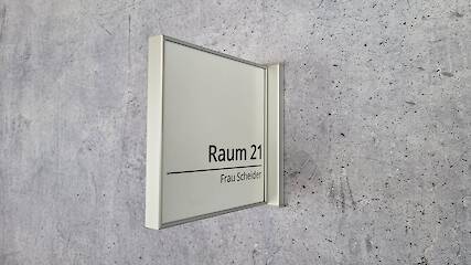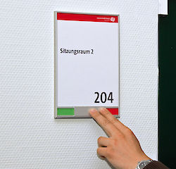 System mit schmalen, umlaufenden Rahmen. Gibt der Innenbeschilderung von Gebäuden eine dezente und elegante Note. Die ausgeklügelte Rahmenbauweise des Schildes sorgt für einen sicheren Einlegerwechsel.