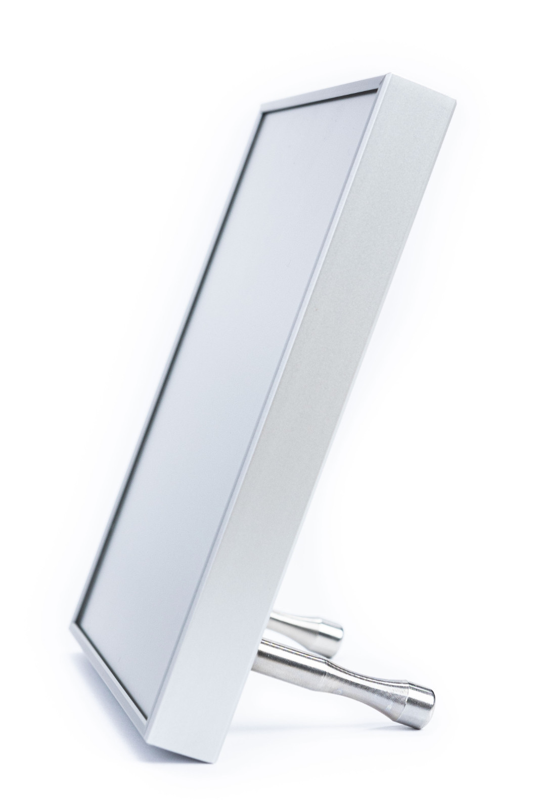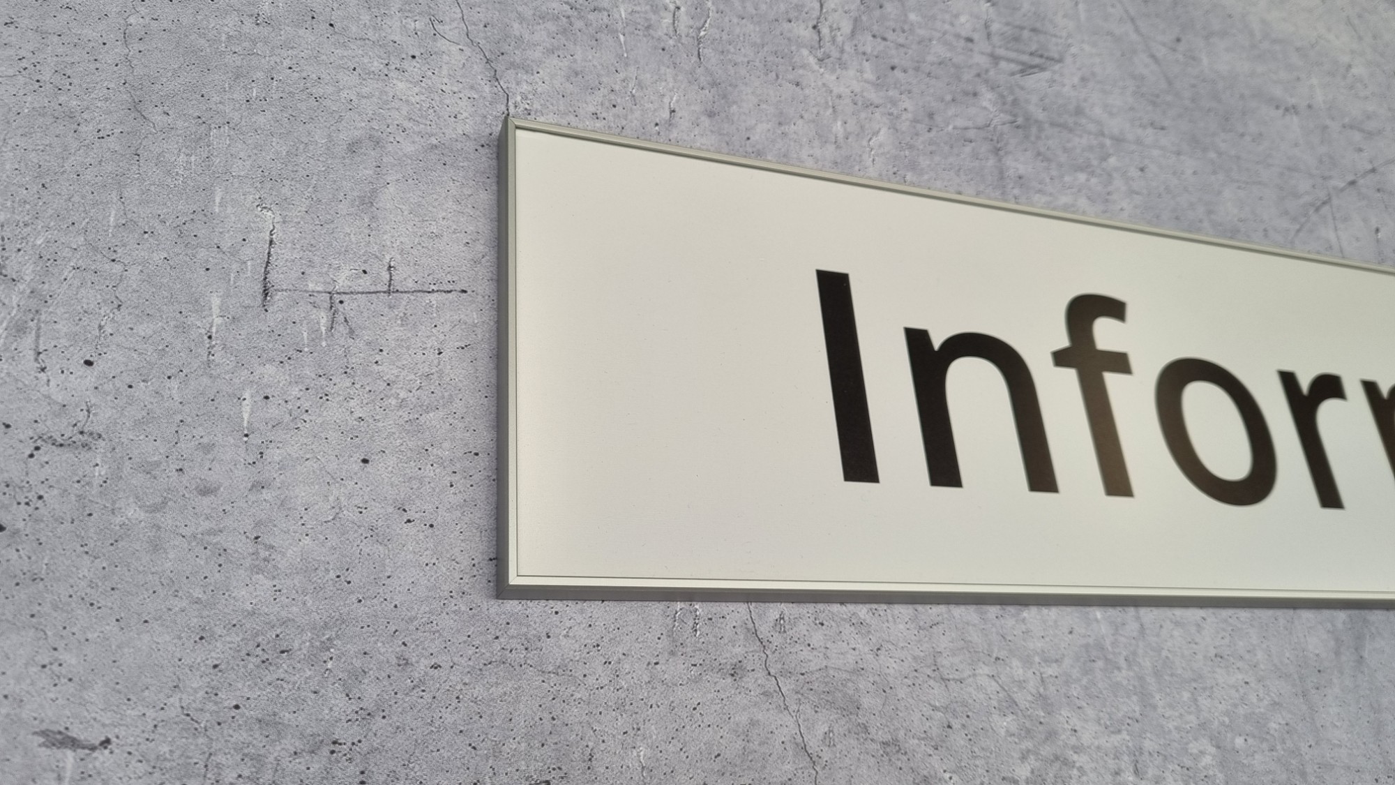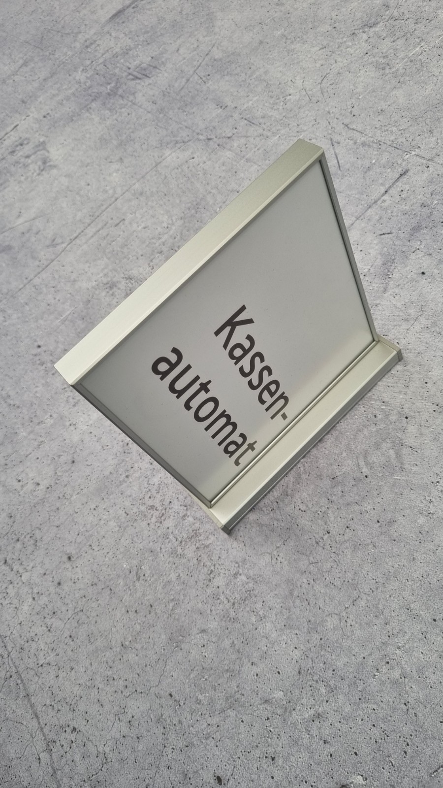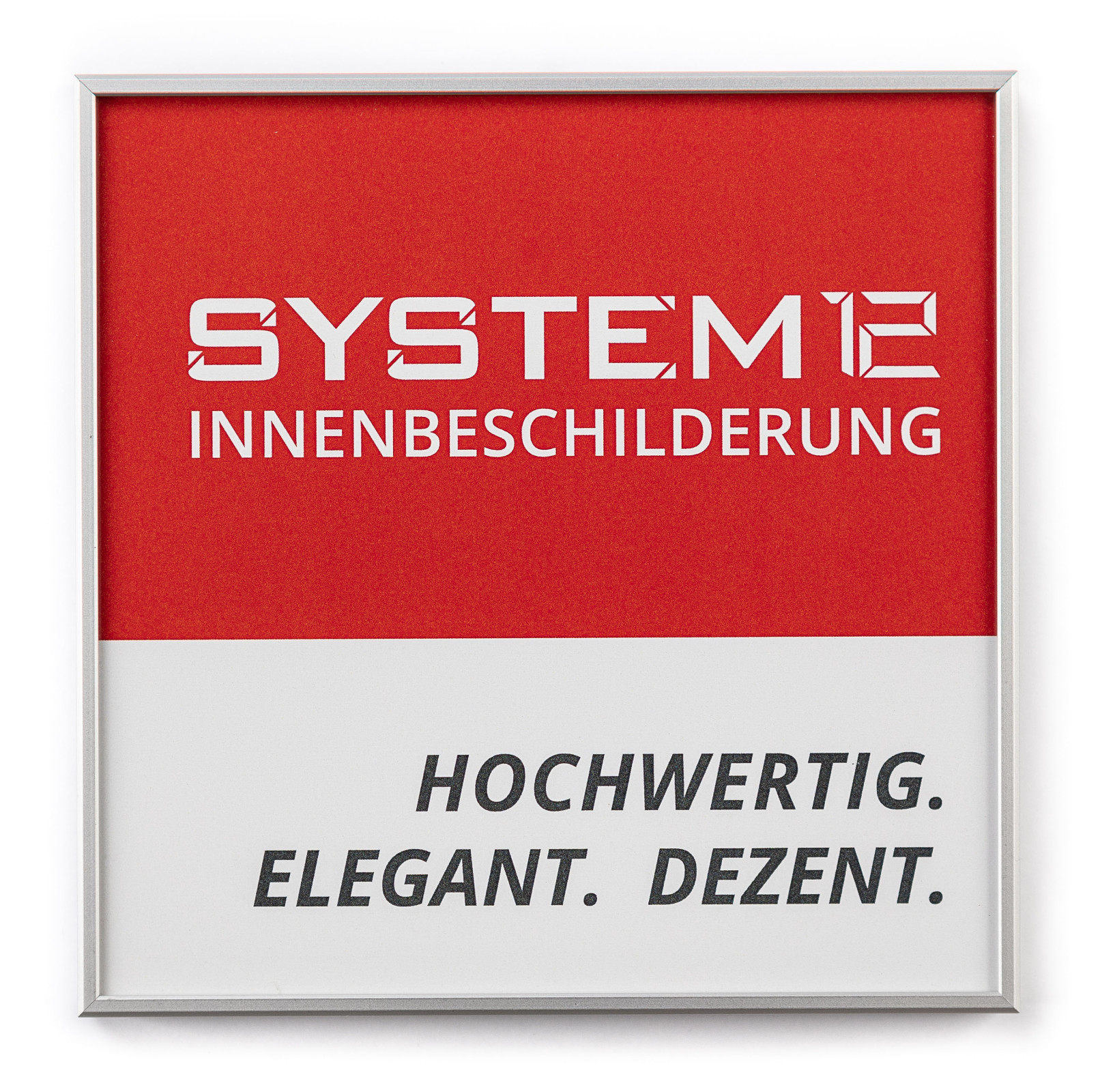 System mit schmalen, umlaufenden Rahmen. Gibt der Innenbeschilderung von Gebäuden eine dezente und elegante Note. Die ausgeklügelte Rahmenbauweise des Schildes sorgt für einen sicheren Einlegerwechsel.