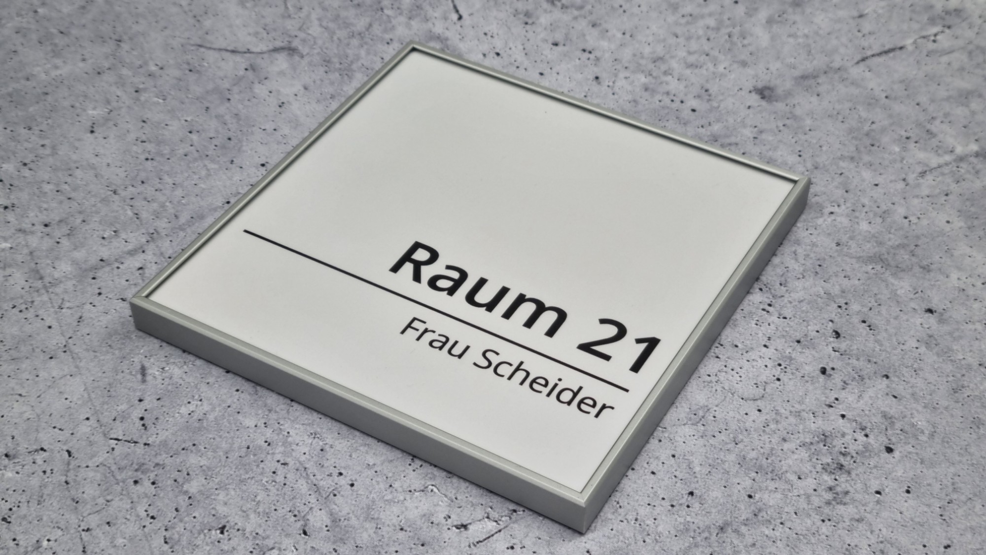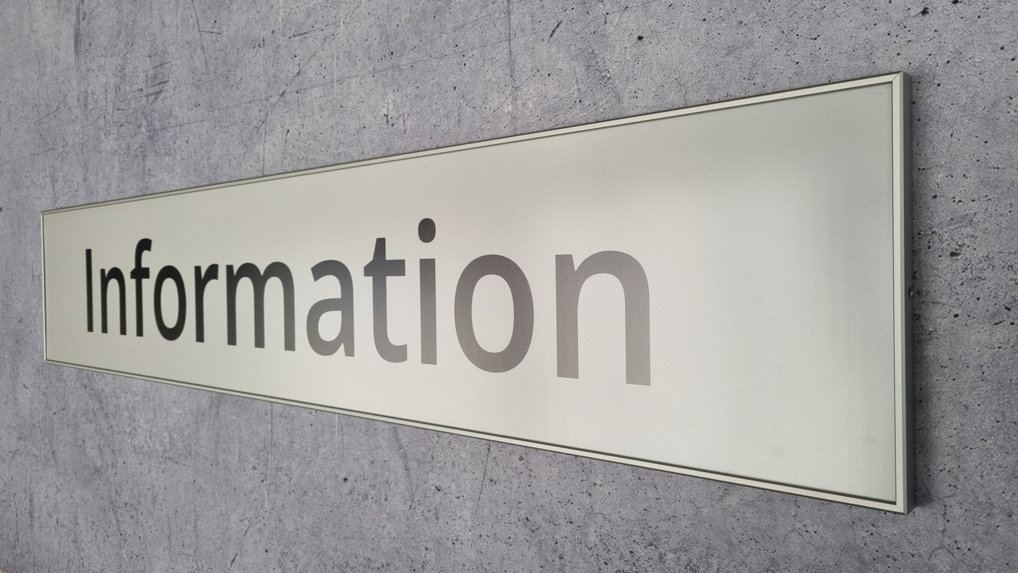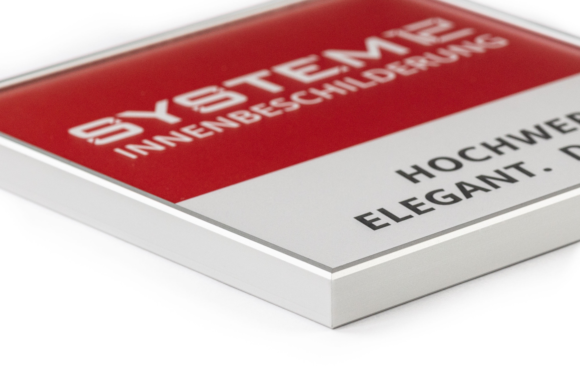 Der schmale umlaufende Rahmen, mit der geringen Bautiefe von nur 12 mm, gibt der Innenbeschilderung von Gebäuden einen dezenten und eleganten Ausdruck.